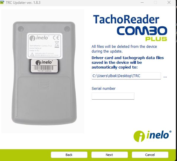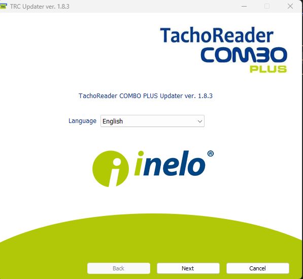 TachoReader Combo Plus (with letters A, B, AT, C at the end of the serial number) – download the installer from the website: https://inelo.com/download/device-software/ (file: TachoReader Combo – Updater [version number].exe).